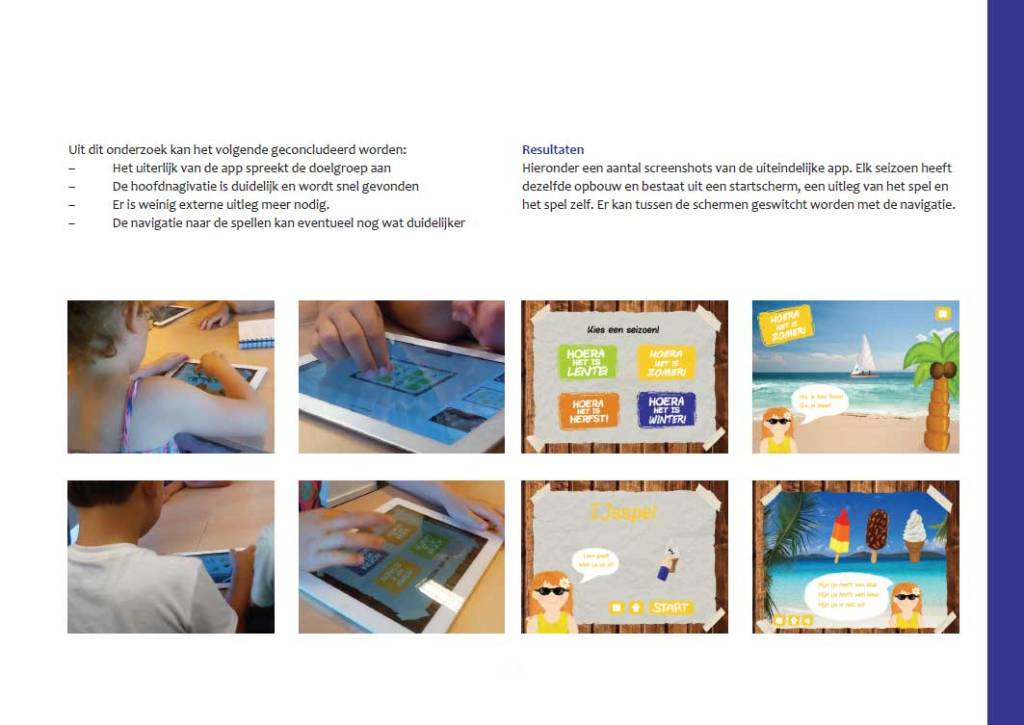 Ik heb bij het ontwerp een combinatie van handgemaakte illustraties en digitale vormgeving gebruikt. In mijn game leren de kinderen de verschillende seizoenen aan de hand van laagdrempelige minigames. Deze game is met een prototype getest door groep 3 van mijn oude basisschool ‘De Meander’.
